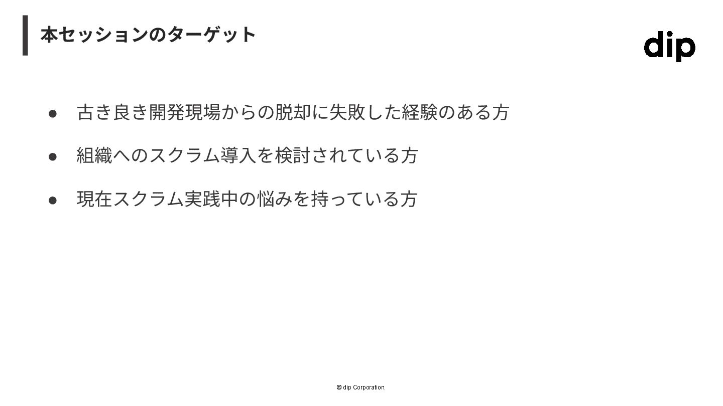 © dip Corporation. 本セッションのターゲット • 古き良き開発現場からの脱却に失敗した経験のある⽅ • 組織へのスクラム導⼊を検討されている⽅ • 現在スクラム実践中の悩みを持っている⽅