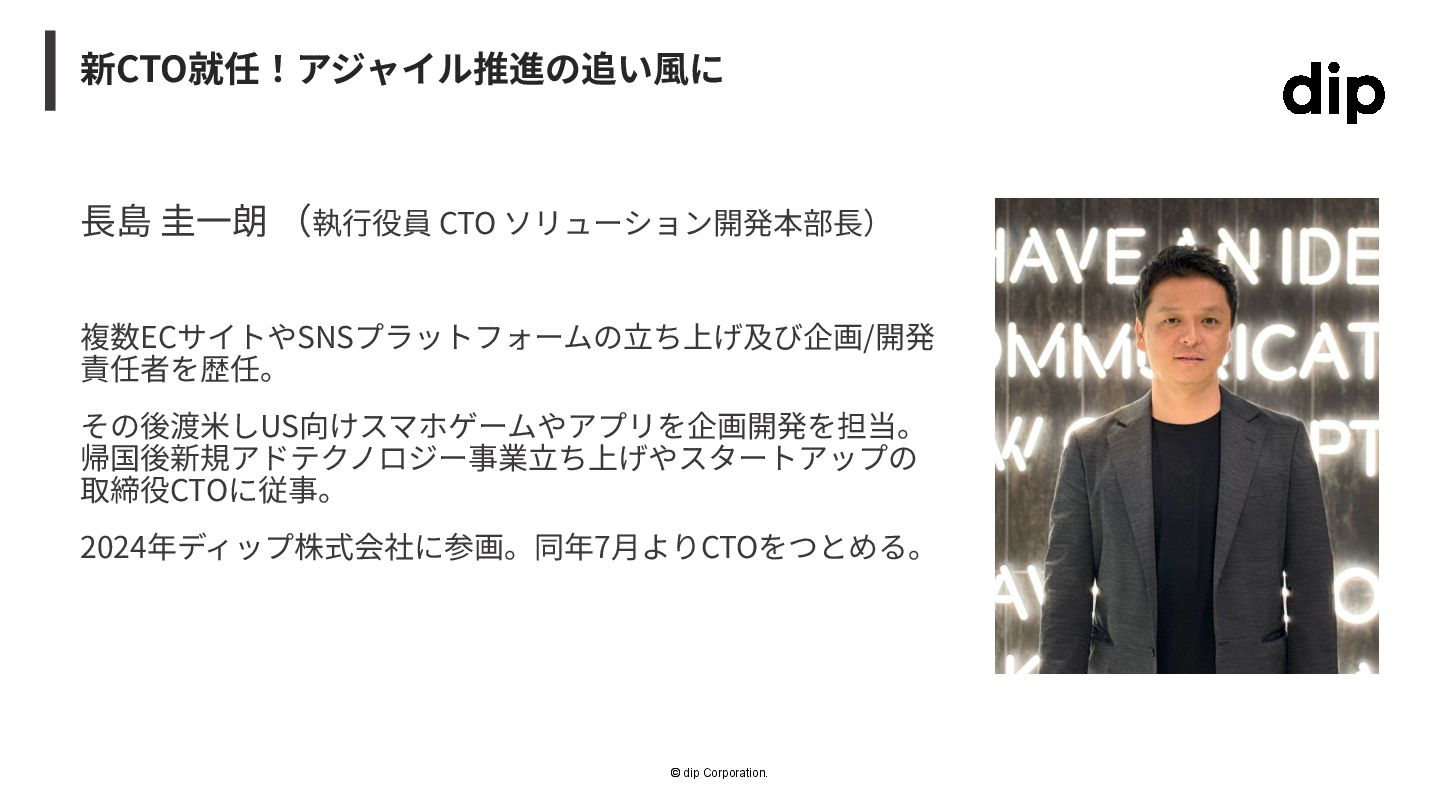 © dip Corporation. 新CTO就任!アジャイル推進の追い⾵に ⻑島 圭⼀朗 (執⾏役員 CTO ソリューション開発本部⻑) 複数ECサイトやSNSプラットフォームの⽴ち上げ及び企画/開発