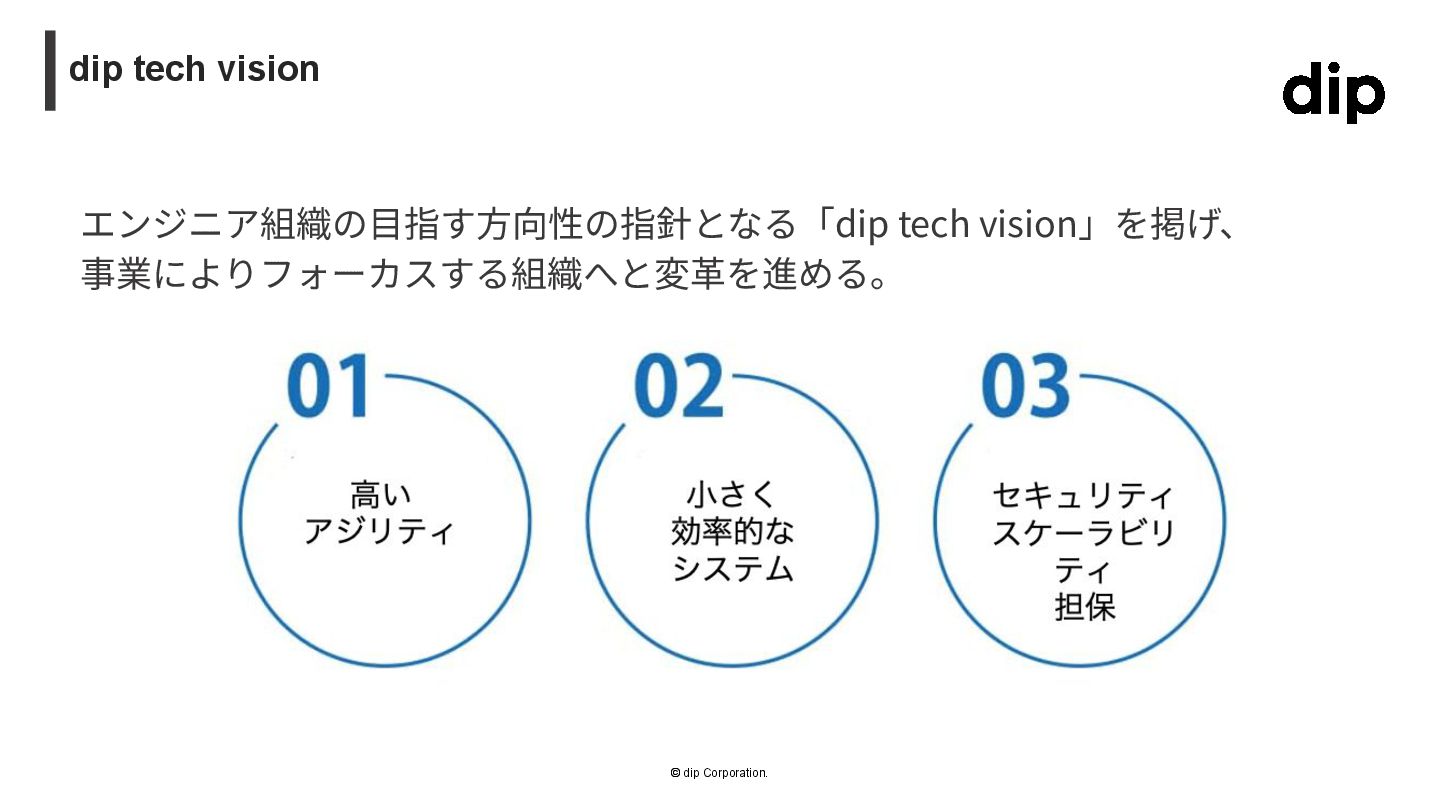 © dip Corporation. dip tech vision エンジニア組織の⽬指す⽅向性の指針となる「dip tech vision」を掲げ、 事業によりフォーカスする組織へと変⾰を進める。