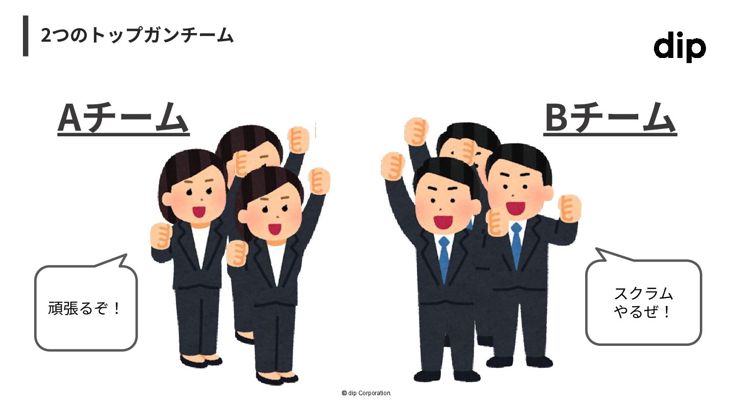 © dip Corporation. 2つのトップガンチーム Bチーム Aチーム 頑張るぞ! スクラム やるぜ!