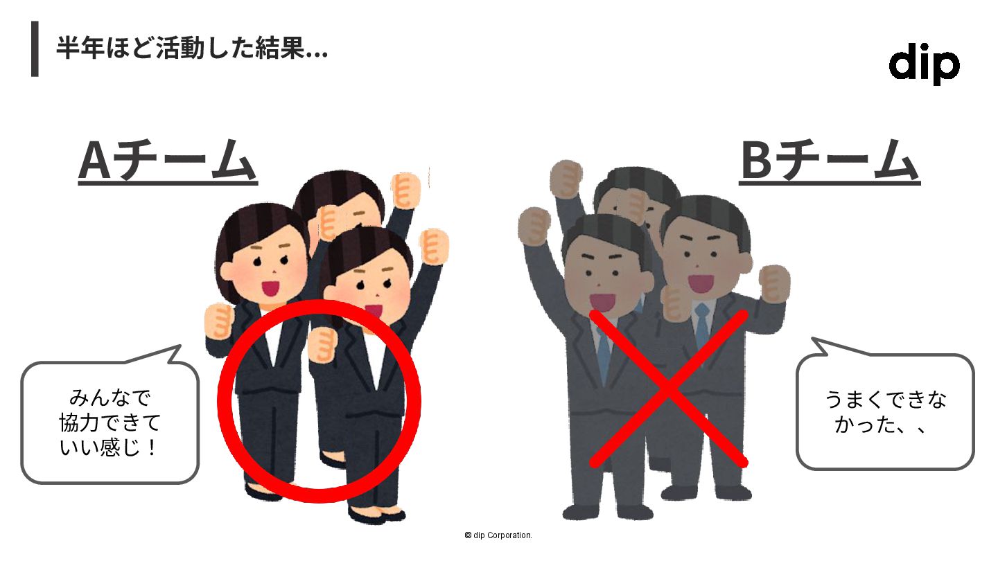 © dip Corporation. 半年ほど活動した結果... Bチーム Aチーム みんなで 協⼒できて いい感じ! うまくできな