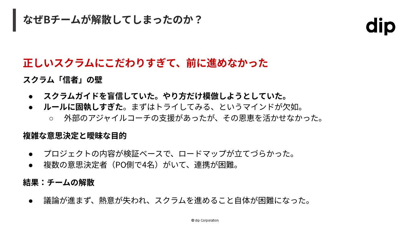 © dip Corporation. なぜBチームが解散してしまったのか? 正しいスクラムにこだわりすぎて、前に進めなかった スクラム「信者」の壁 • スクラムガイドを盲信していた。やり⽅だけ模倣しようとしていた。 • ルールに固執しすぎた。まずはトライしてみる、というマインドが⽋如。
