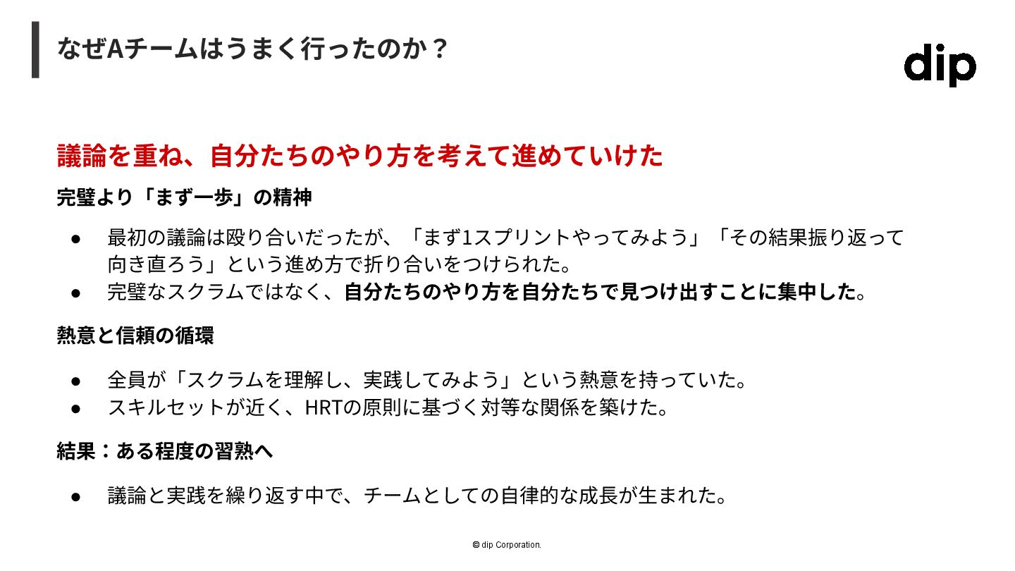 © dip Corporation. なぜAチームはうまく⾏ったのか? 議論を重ね、⾃分たちのやり⽅を考えて進めていけた 完璧より「まず⼀歩」の精神 • 最初の議論は殴り合いだったが、「まず1スプリントやってみよう」「その結果振り返って 向き直ろう」という進め⽅で折り合いをつけられた。 •