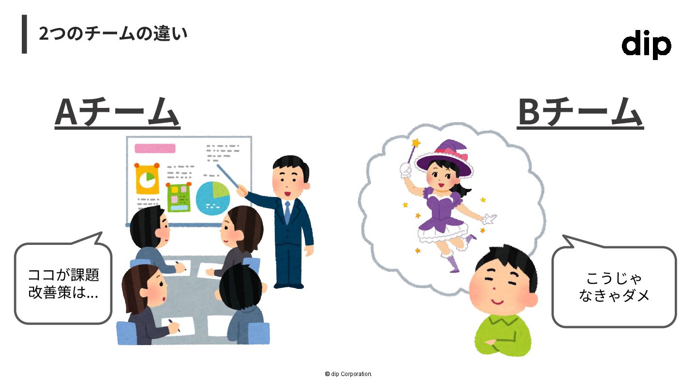 © dip Corporation. 2つのチームの違い Bチーム Aチーム ココが課題 改善策は... こうじゃ なきゃダメ