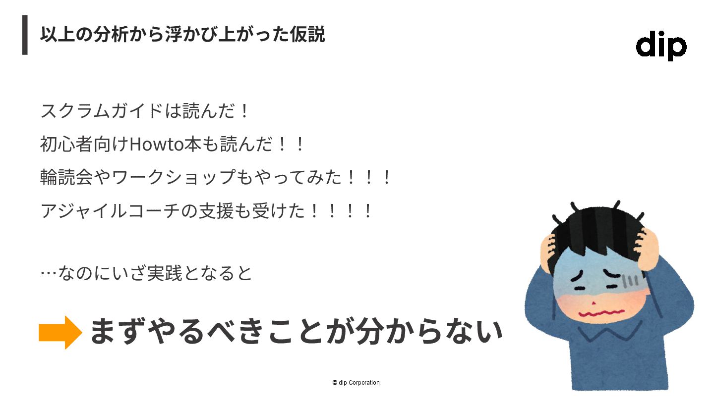 © dip Corporation. 以上の分析から浮かび上がった仮説 スクラムガイドは読んだ! 初⼼者向けHowto本も読んだ!! 輪読会やワークショップもやってみた!!! アジャイルコーチの⽀援も受けた!!!! …なのにいざ実践となると まずやるべきことが分からない