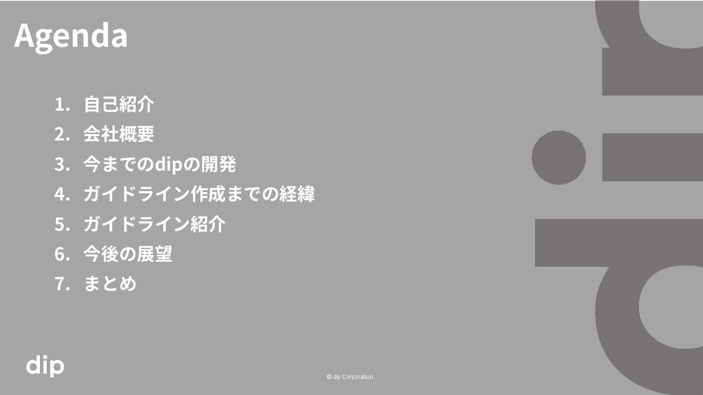 © dip Corporation.. Agenda 1. ⾃⼰紹介 2. 会社概要 3. 今までのdipの開発