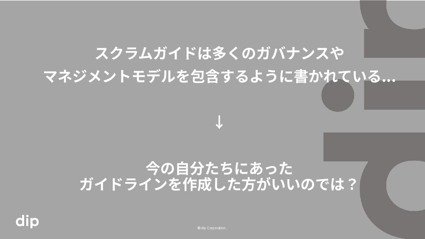 © dip Corporation.. スクラムガイドは多くのガバナンスや マネジメントモデルを包含するように書かれている... ↓ 今の⾃分たちにあった ガイドラインを作成した⽅がいいのでは?