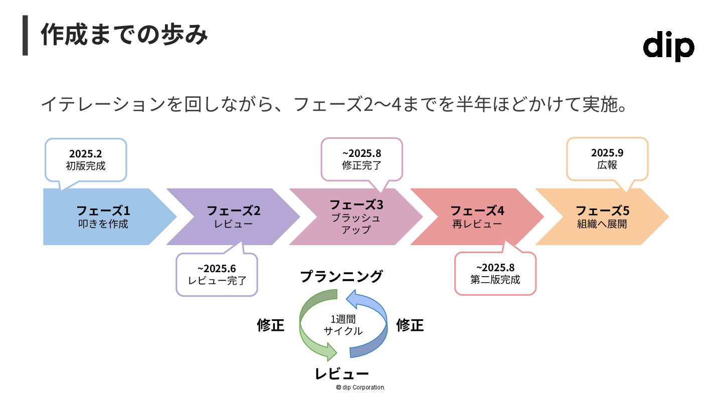 © dip Corporation. 作成までの歩み イテレーションを回しながら、フェーズ2〜4までを半年ほどかけて実施。 フェーズ1 叩きを作成 フェーズ2 レビュー フェーズ3