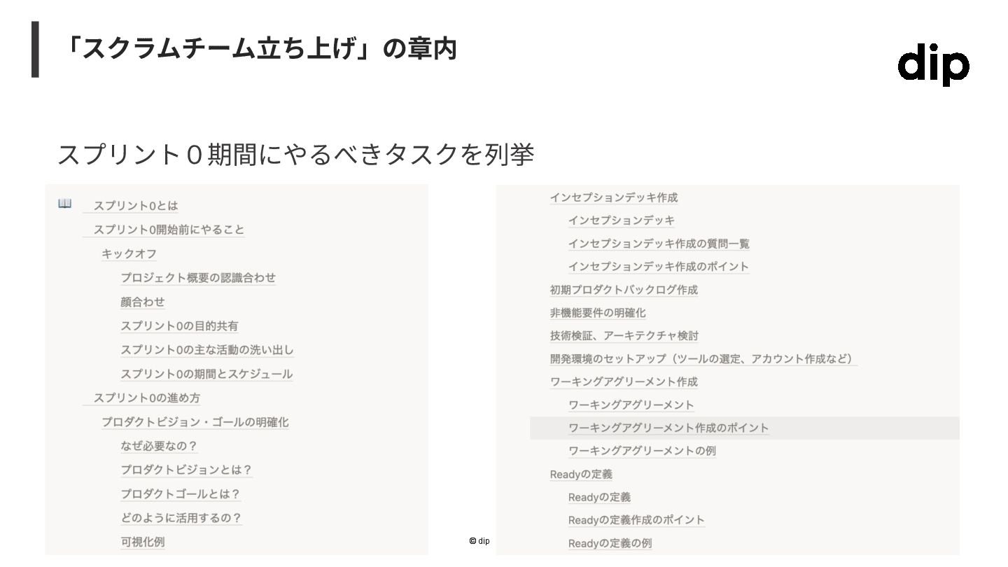 © dip Corporation. 「スクラムチーム⽴ち上げ」の章内 スプリント0期間にやるべきタスクを列挙