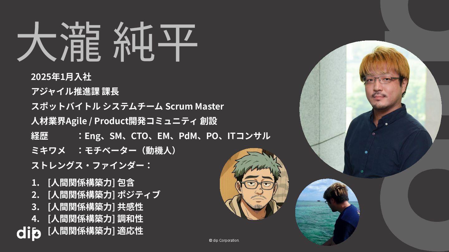 © dip Corporation. ⼤瀧 純平 2025年1⽉⼊社 アジャイル推進課 課⻑ スポットバイトル システムチーム