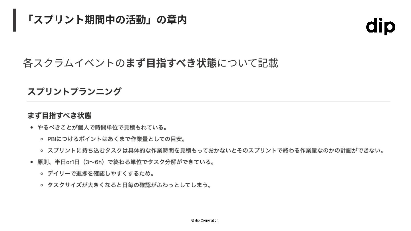 © dip Corporation. 「スプリント期間中の活動」の章内 各スクラムイベントのまず⽬指すべき状態について記載