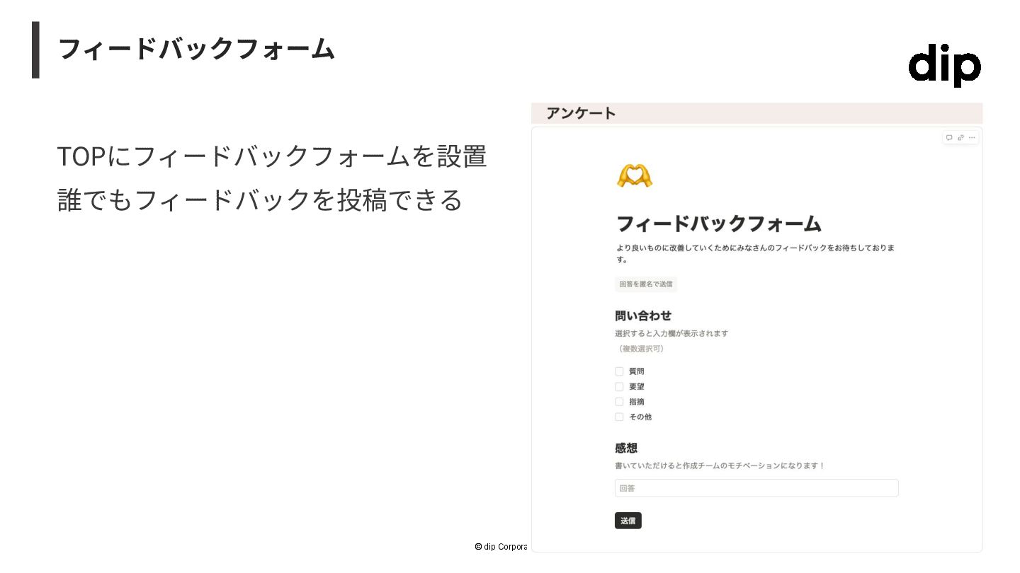© dip Corporation. フィードバックフォーム TOPにフィードバックフォームを設置 誰でもフィードバックを投稿できる