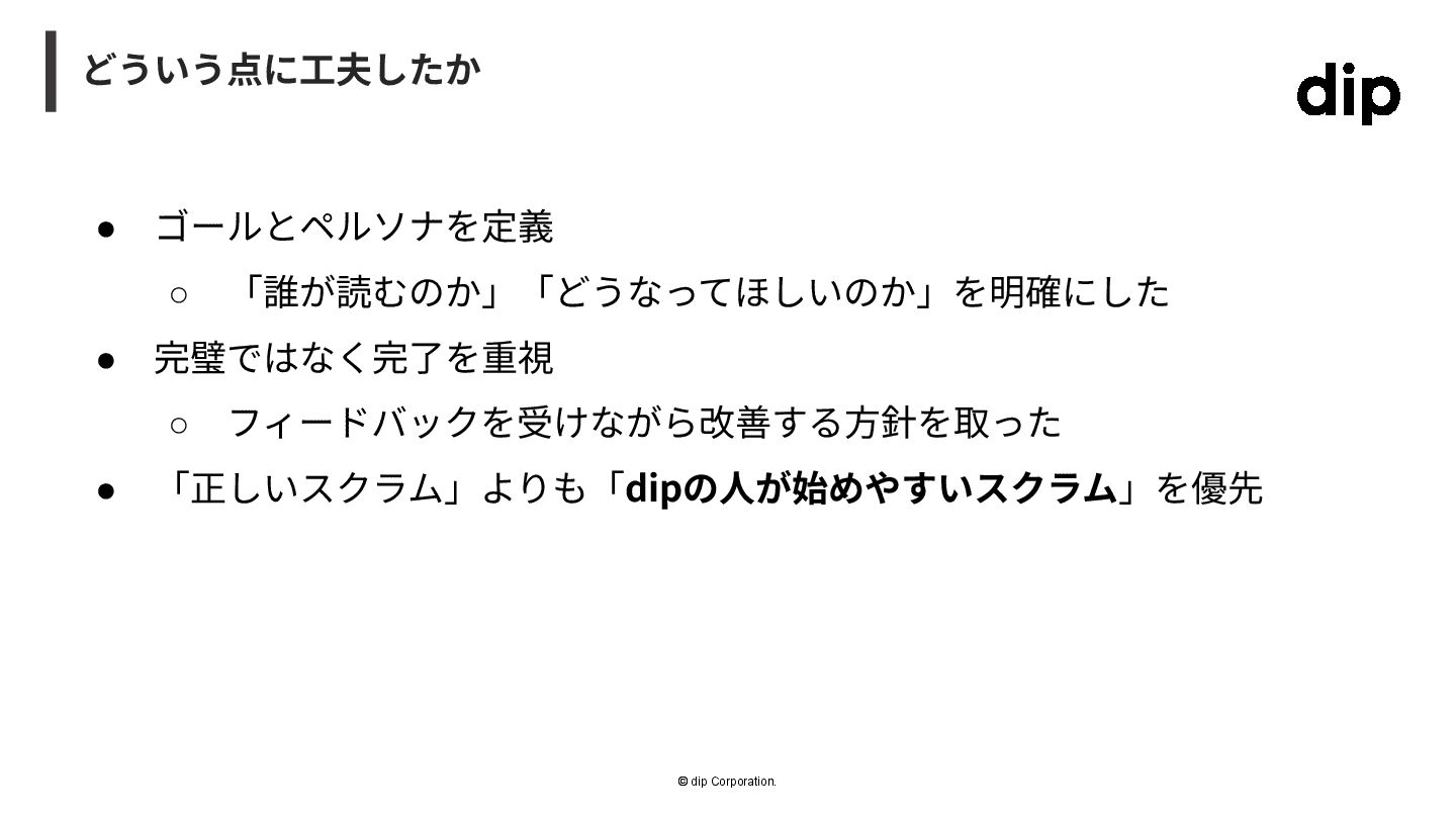 © dip Corporation. どういう点に⼯夫したか • ゴールとペルソナを定義 ◦ 「誰が読むのか」「どうなってほしいのか」を明確にした • 完璧ではなく完了を重視