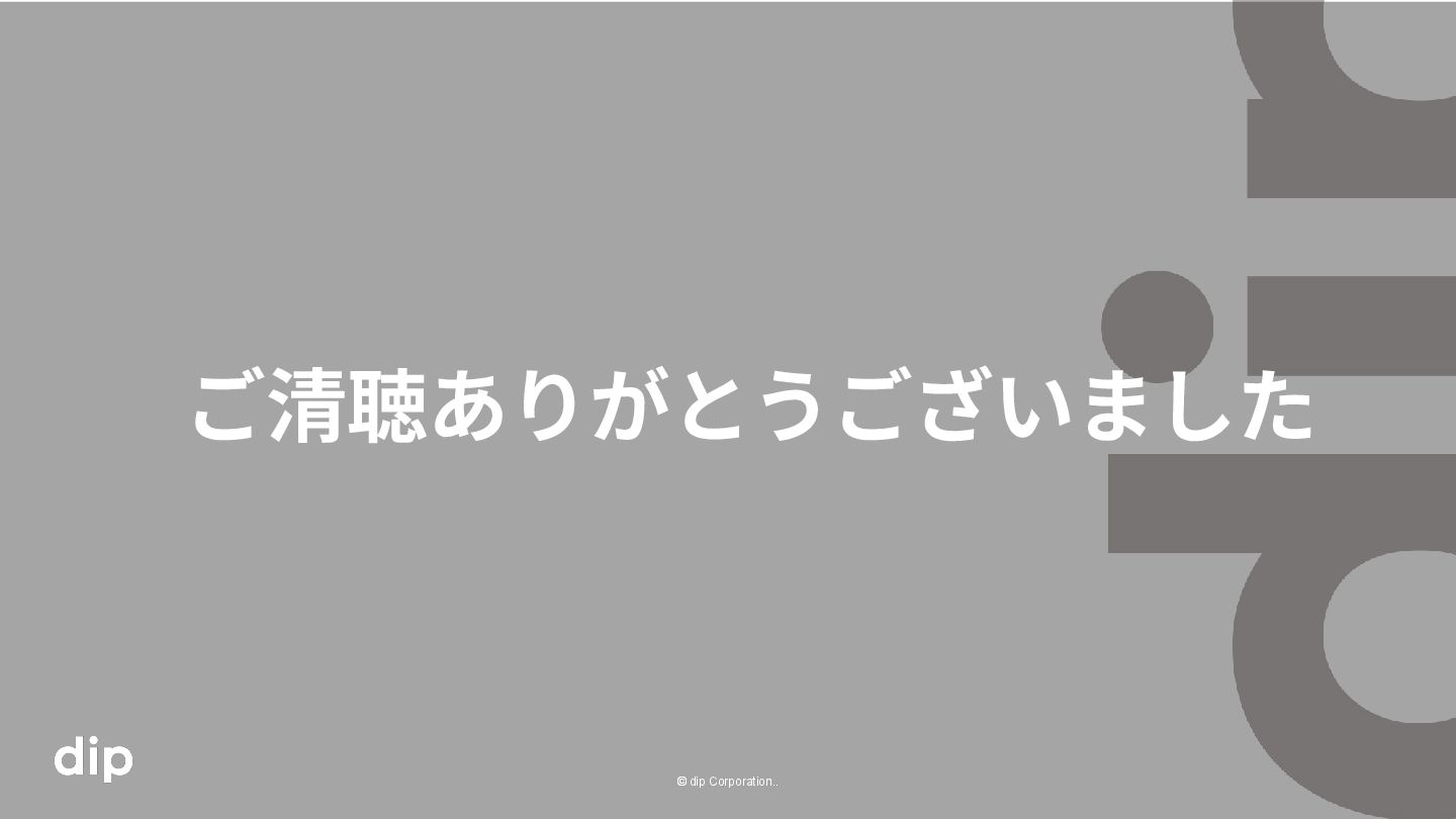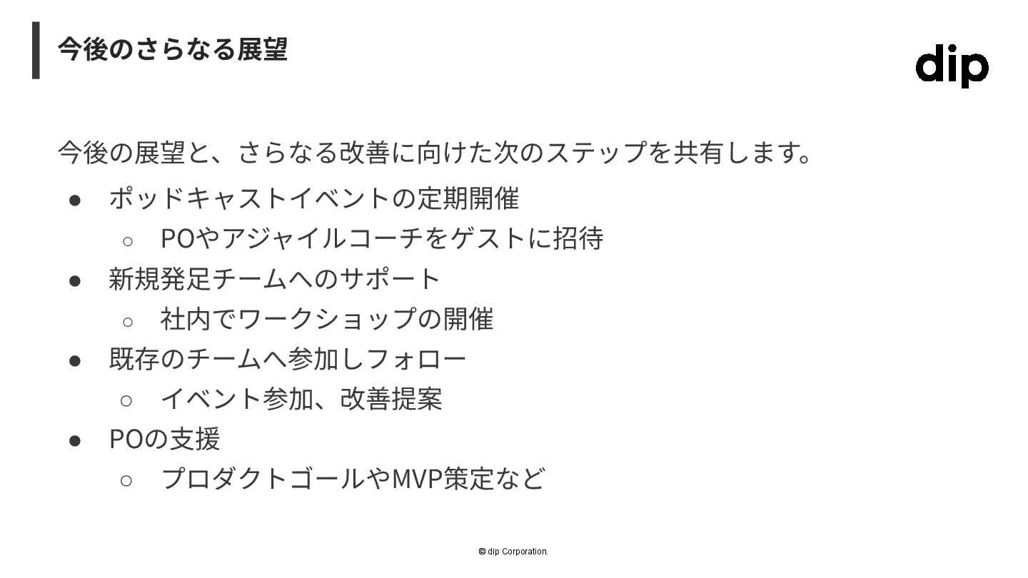 © dip Corporation. 今後のさらなる展望 今後の展望と、さらなる改善に向けた次のステップを共有します。 • ポッドキャストイベントの定期開催 ◦ POやアジャイルコーチをゲストに招待 •