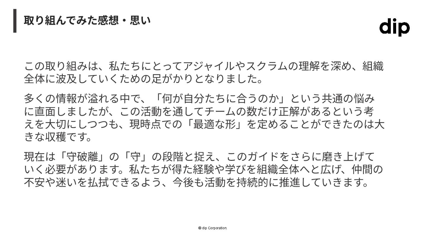 © dip Corporation. 取り組んでみた感想‧思い この取り組みは、私たちにとってアジャイルやスクラムの理解を深め、組織 全体に波及していくための⾜がかりとなりました。 多くの情報が溢れる中で、「何が⾃分たちに合うのか」という共通の悩み に直⾯しましたが、この活動を通してチームの数だけ正解があるという考 えを⼤切にしつつも、現時点での「最適な形」を定めることができたのは⼤ きな収穫です。