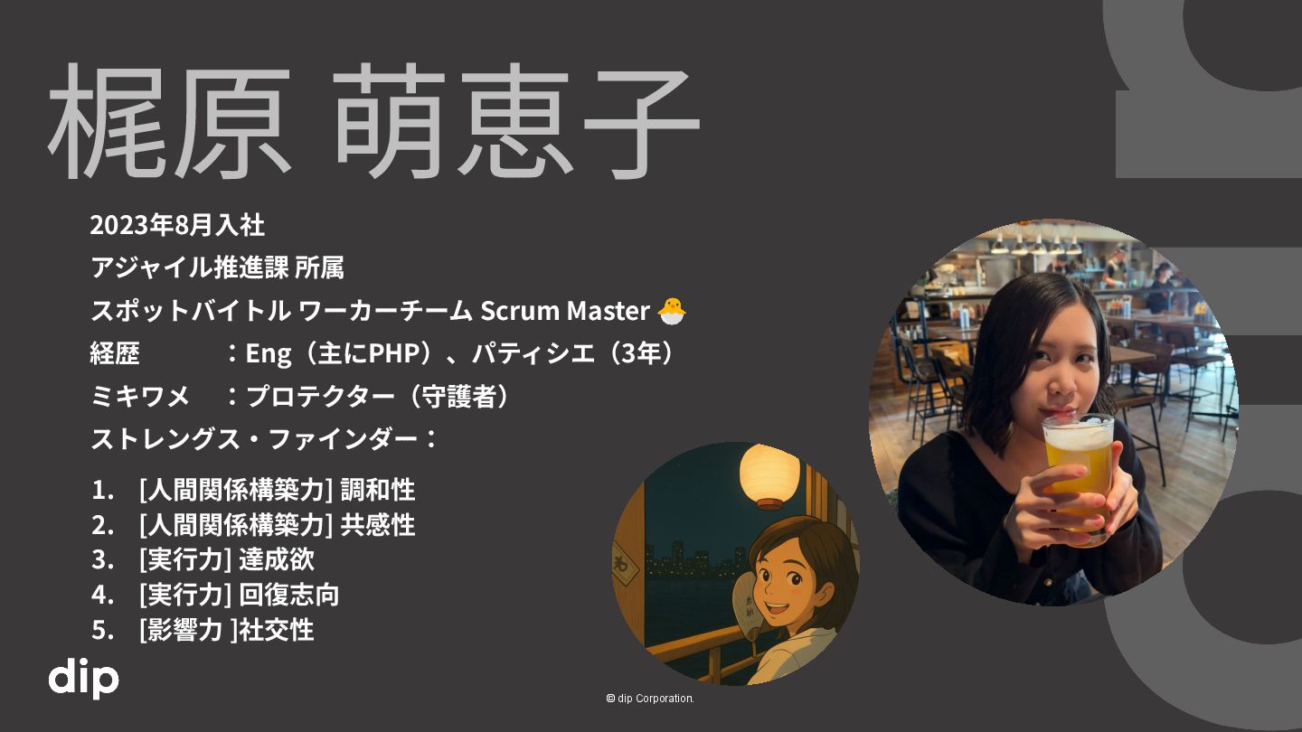 © dip Corporation. 梶原 萌恵⼦ 2023年8⽉⼊社 アジャイル推進課 所属 スポットバイトル ワーカーチーム