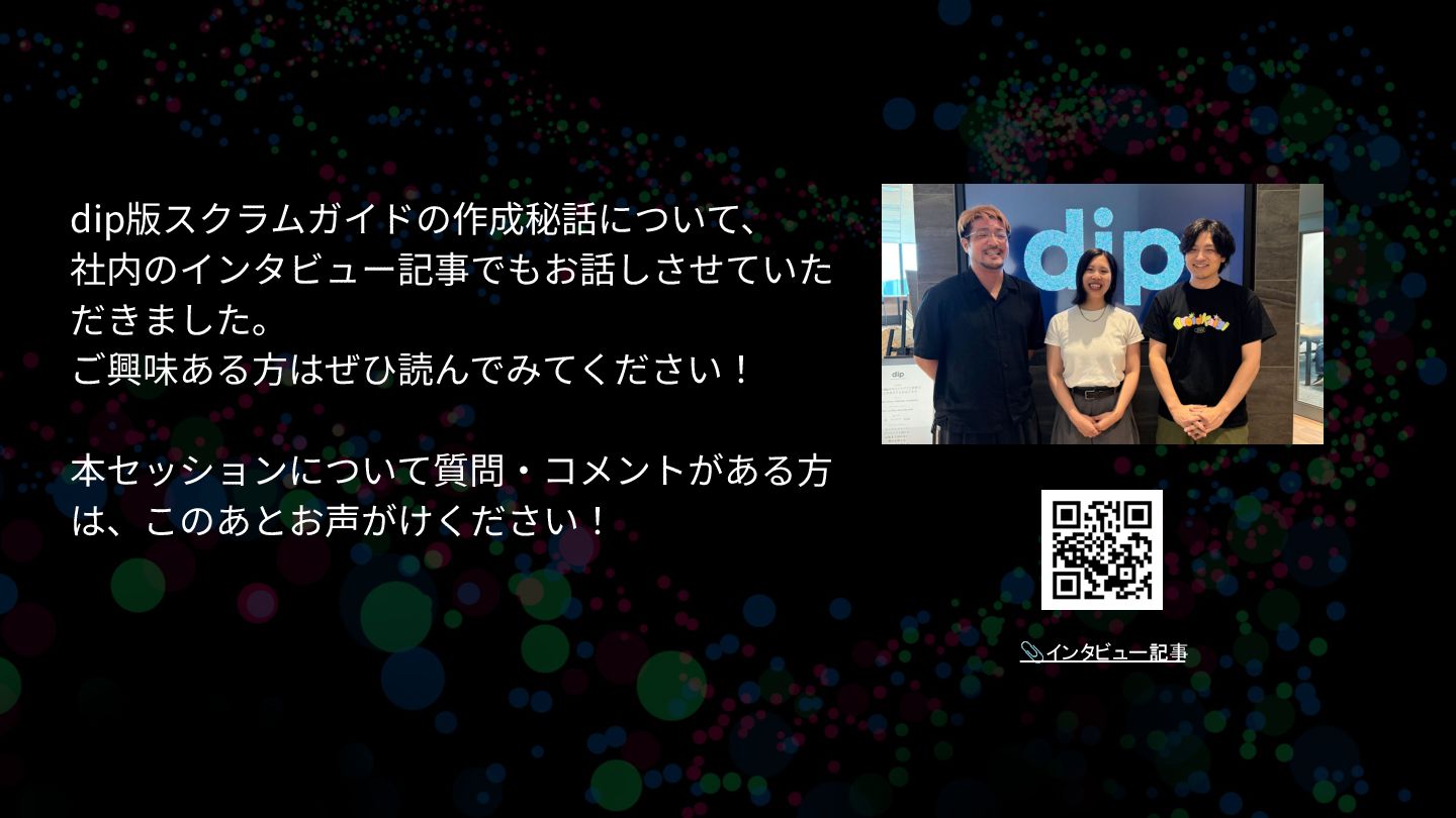 dip版スクラムガイドの作成秘話について、 社内のインタビュー記事でもお話しさせていた だきました。 ご興味ある⽅はぜひ読んでみてください! 本セッションについて質問‧コメントがある⽅ は、このあとお声がけください! 📎インタビュー記事