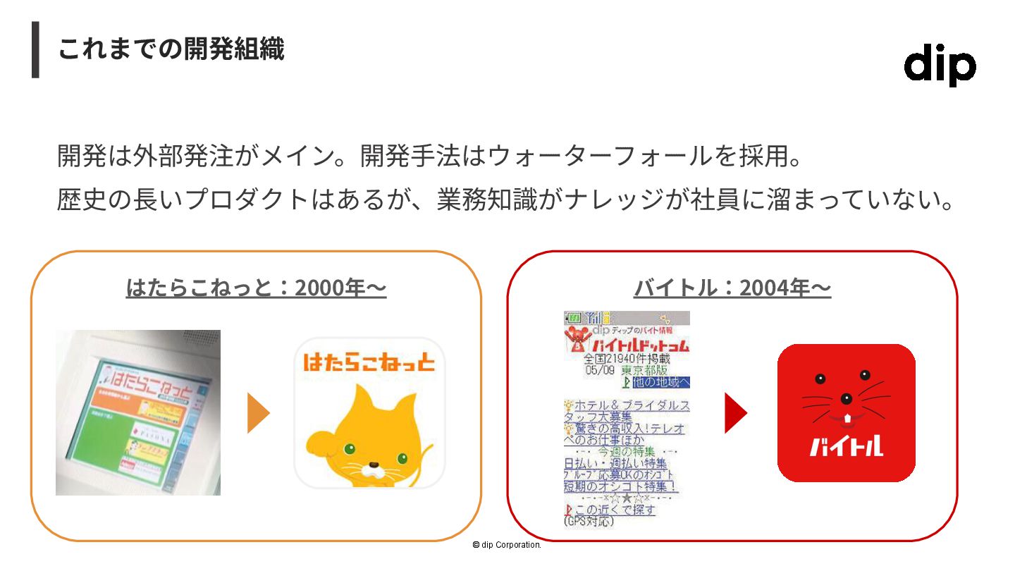 © dip Corporation. バイトル:2004年〜 はたらこねっと:2000年〜 これまでの開発組織 開発は外部発注がメイン。開発⼿法はウォーターフォールを採⽤。 歴史の⻑いプロダクトはあるが、業務知識がナレッジが社員に溜まっていない。