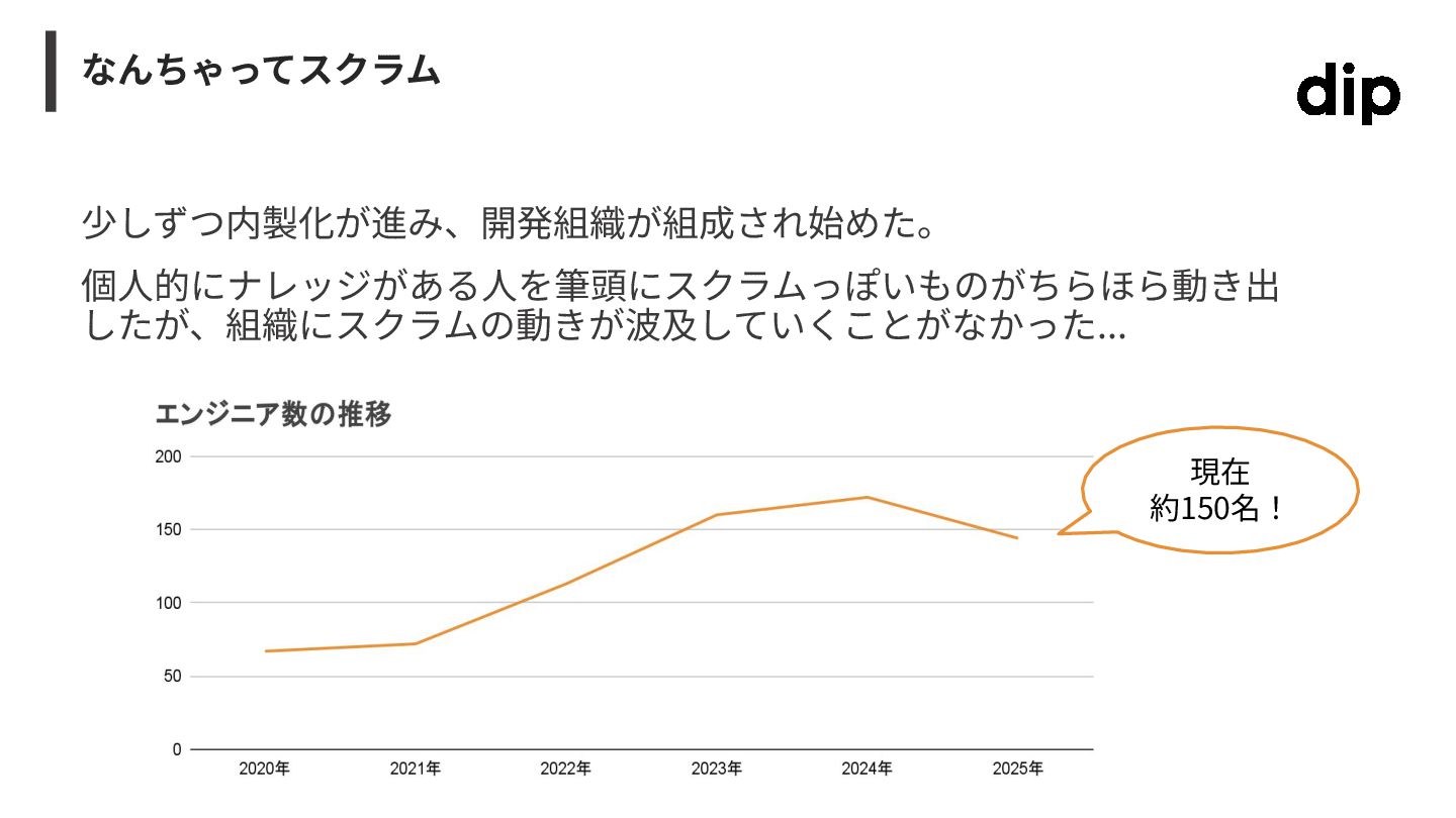 © dip Corporation. なんちゃってスクラム 少しずつ内製化が進み、開発組織が組成され始めた。 個⼈的にナレッジがある⼈を筆頭にスクラムっぽいものがちらほら動き出 したが、組織にスクラムの動きが波及していくことがなかった... 現在 約150名!