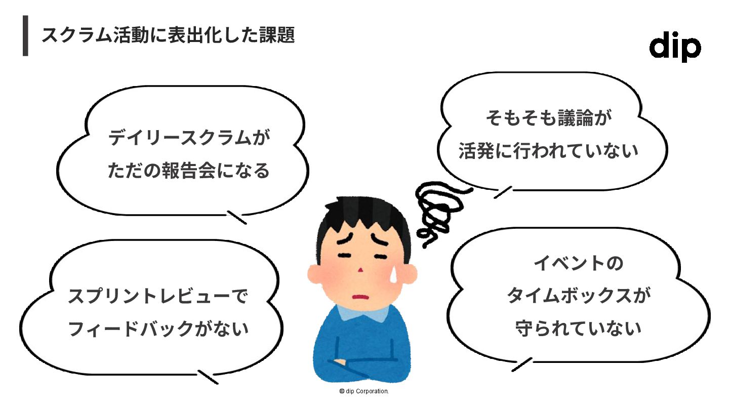 © dip Corporation. スクラム活動に表出化した課題 デイリースクラムが ただの報告会になる スプリントレビューで フィードバックがない そもそも議論が 活発に⾏われていない