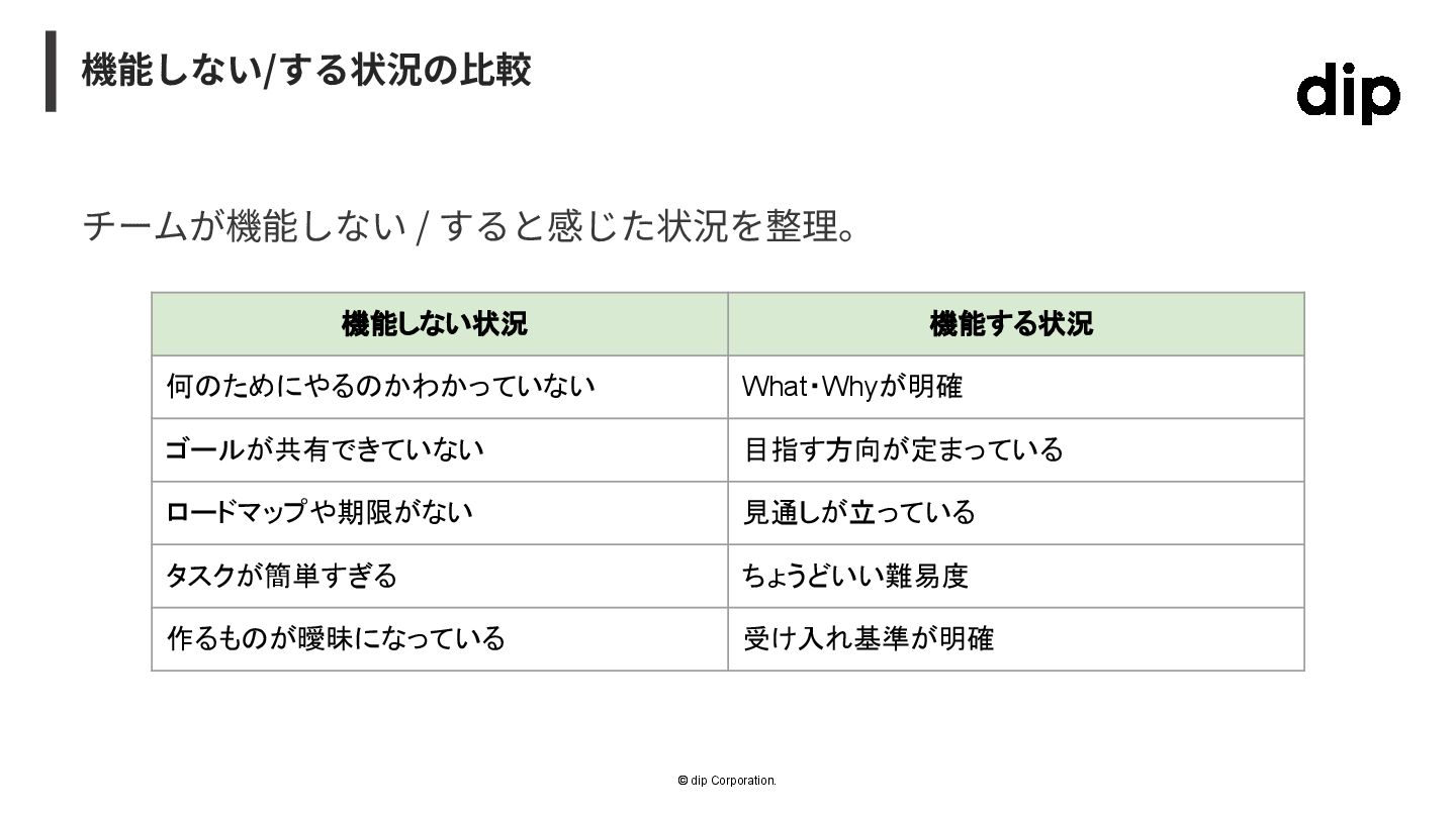 © dip Corporation. 機能しない/する状況の⽐較 機能しない状況 機能する状況 何のためにやるのかわかっていない What・Whyが明確 ゴールが共有できていない 目指す方向が定まっている