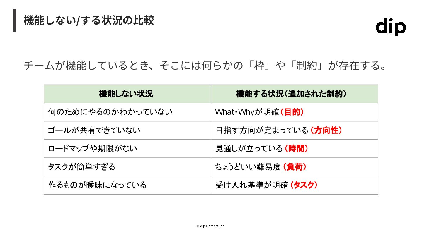 © dip Corporation. 機能しない/する状況の⽐較 機能しない状況 機能する状況(追加された制約) 何のためにやるのかわかっていない What・Whyが明確(目的) ゴールが共有できていない 目指す方向が定まっている
