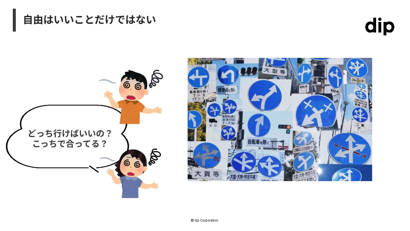 © dip Corporation. ⾃由はいいことだけではない どっち⾏けばいいの? こっちで合ってる?