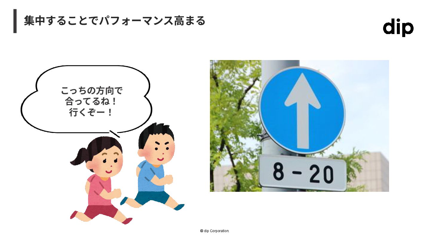 © dip Corporation. 集中することでパフォーマンス⾼まる こっちの⽅向で 合ってるね! ⾏くぞー!