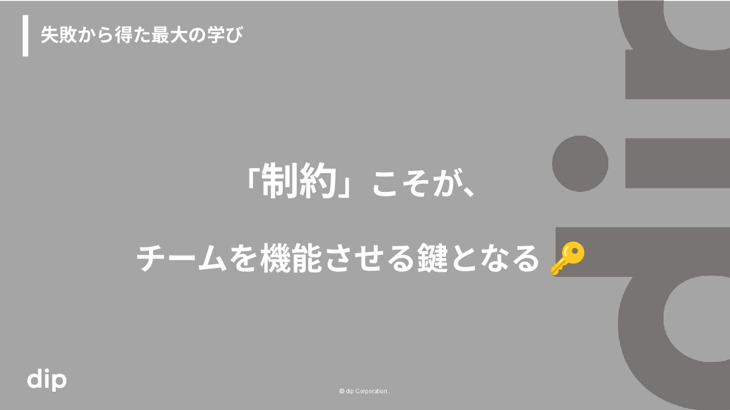 © dip Corporation.. 「制約」こそが、 チームを機能させる鍵となる 🔑 失敗から得た最⼤の学び