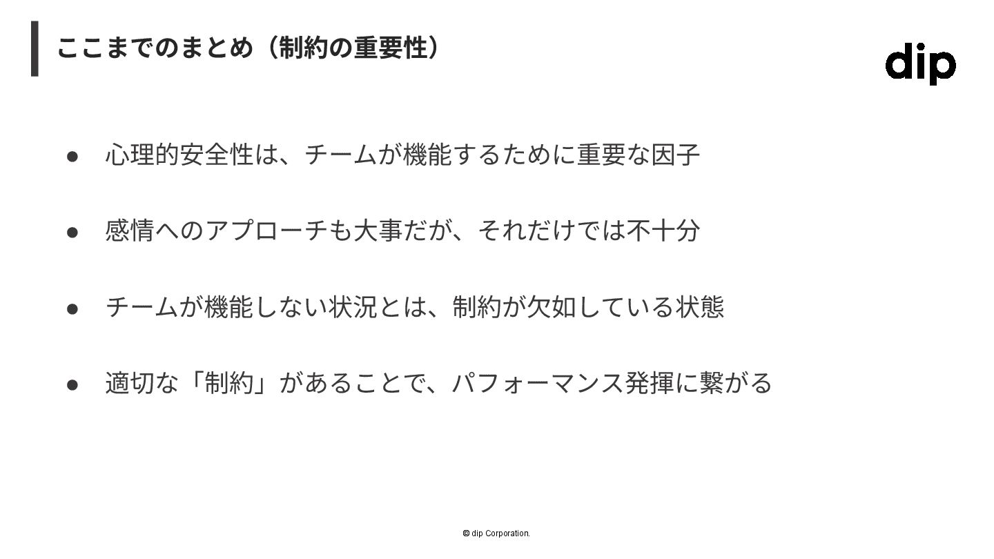 © dip Corporation. ここまでのまとめ(制約の重要性) • ⼼理的安全性は、チームが機能するために重要な因⼦ • 感情へのアプローチも⼤事だが、それだけでは不⼗分 • チームが機能しない状況とは、制約が⽋如している状態