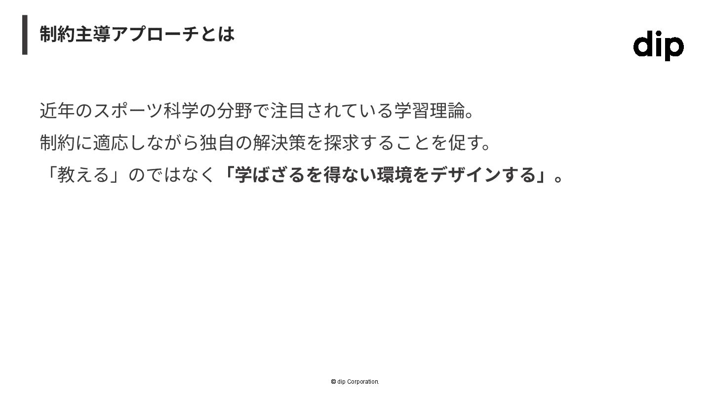 © dip Corporation. 制約主導アプローチとは 近年のスポーツ科学の分野で注⽬されている学習理論。 制約に適応しながら独⾃の解決策を探求することを促す。 「教える」のではなく「学ばざるを得ない環境をデザインする」。