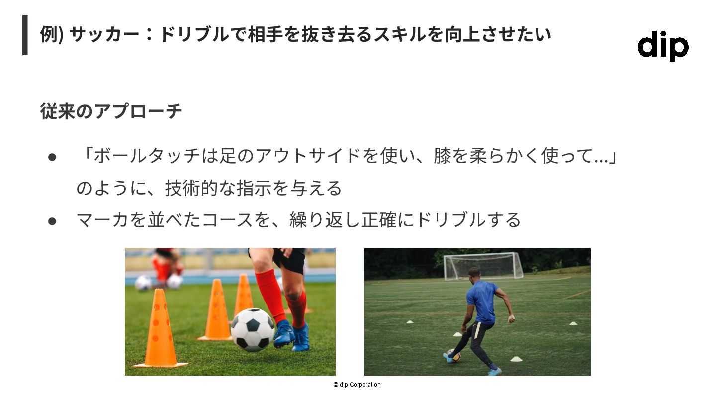 © dip Corporation. 例) サッカー:ドリブルで相⼿を抜き去るスキルを向上させたい 従来のアプローチ • 「ボールタッチは⾜のアウトサイドを使い、膝を柔らかく使って...」 のように、技術的な指⽰を与える •