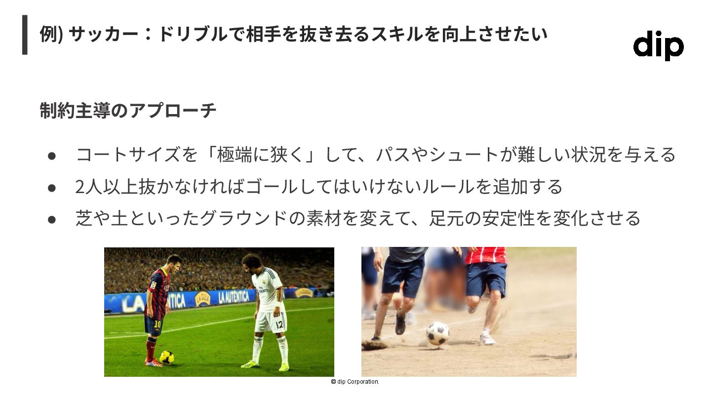 © dip Corporation. 制約主導のアプローチ • コートサイズを「極端に狭く」して、パスやシュートが難しい状況を与える • 2⼈以上抜かなければゴールしてはいけないルールを追加する • 芝や⼟といったグラウンドの素材を変えて、⾜元の安定性を変化させる