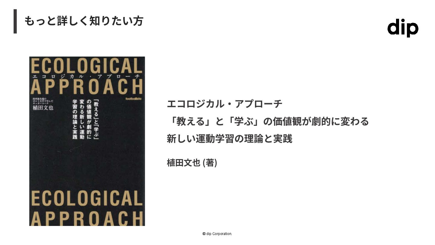 © dip Corporation. もっと詳しく知りたい⽅ エコロジカル‧アプローチ 「教える」と「学ぶ」の価値観が劇的に変わる 新しい運動学習の理論と実践 植⽥⽂也 (著)