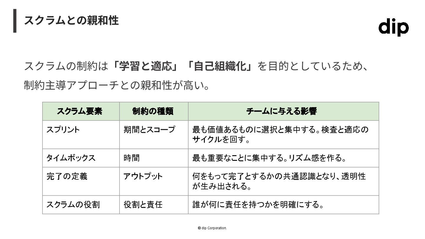 © dip Corporation. スクラムとの親和性 スクラム要素 制約の種類 チームに与える影響 スプリント 期間とスコープ 最も価値あるものに選択と集中する。検査と適応の