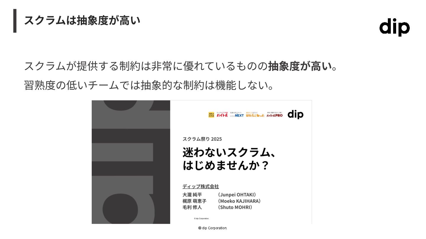 © dip Corporation. スクラムは抽象度が⾼い スクラムが提供する制約は⾮常に優れているものの抽象度が⾼い。 習熟度の低いチームでは抽象的な制約は機能しない。