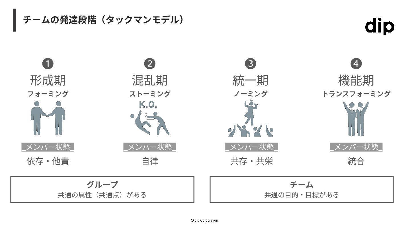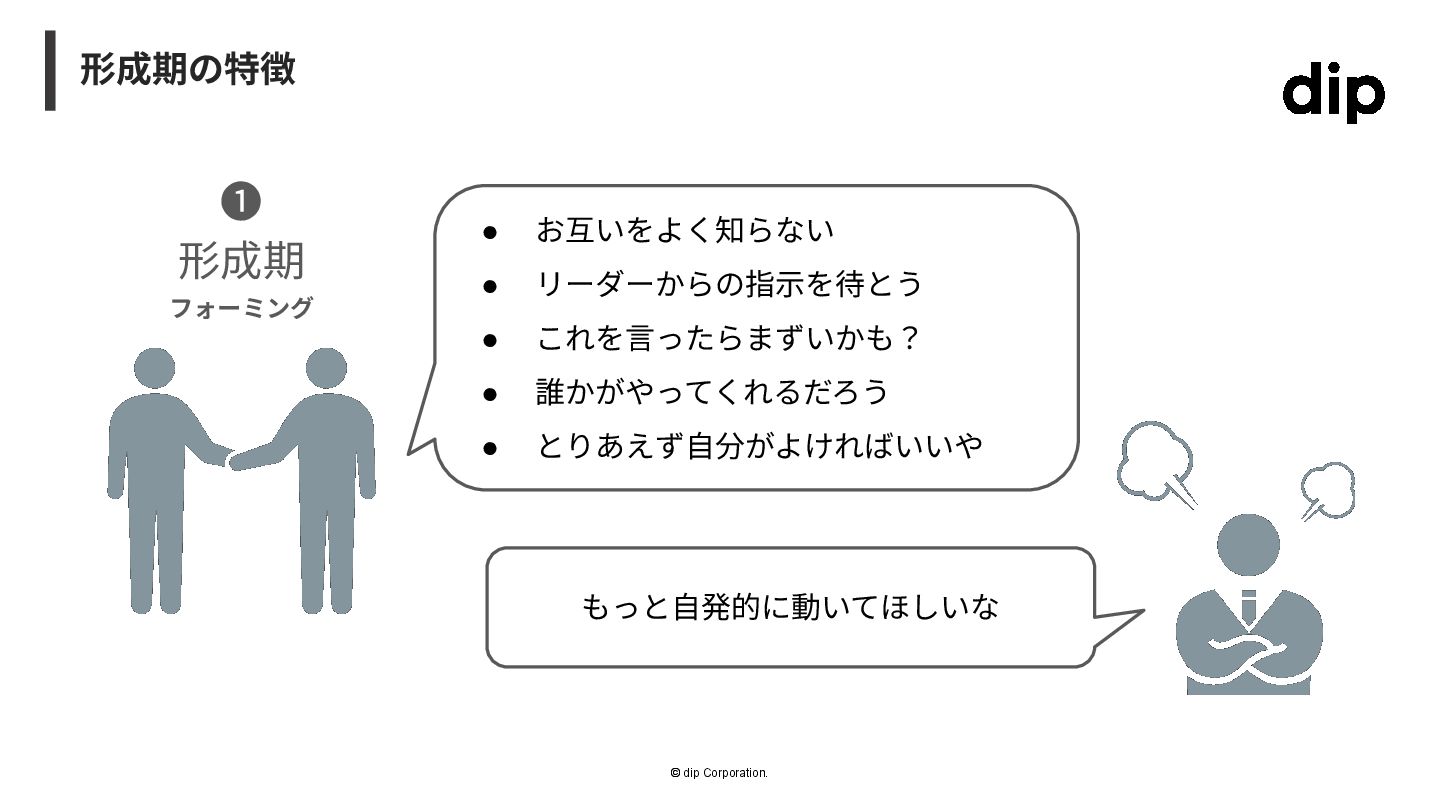 © dip Corporation. 形成期の特徴 ❶ 形成期 フォーミング • お互いをよく知らない •