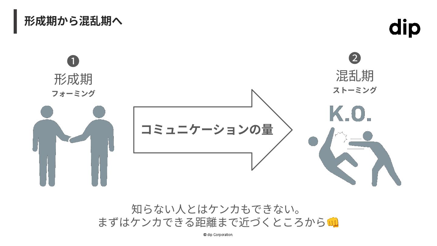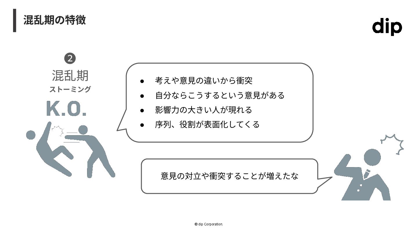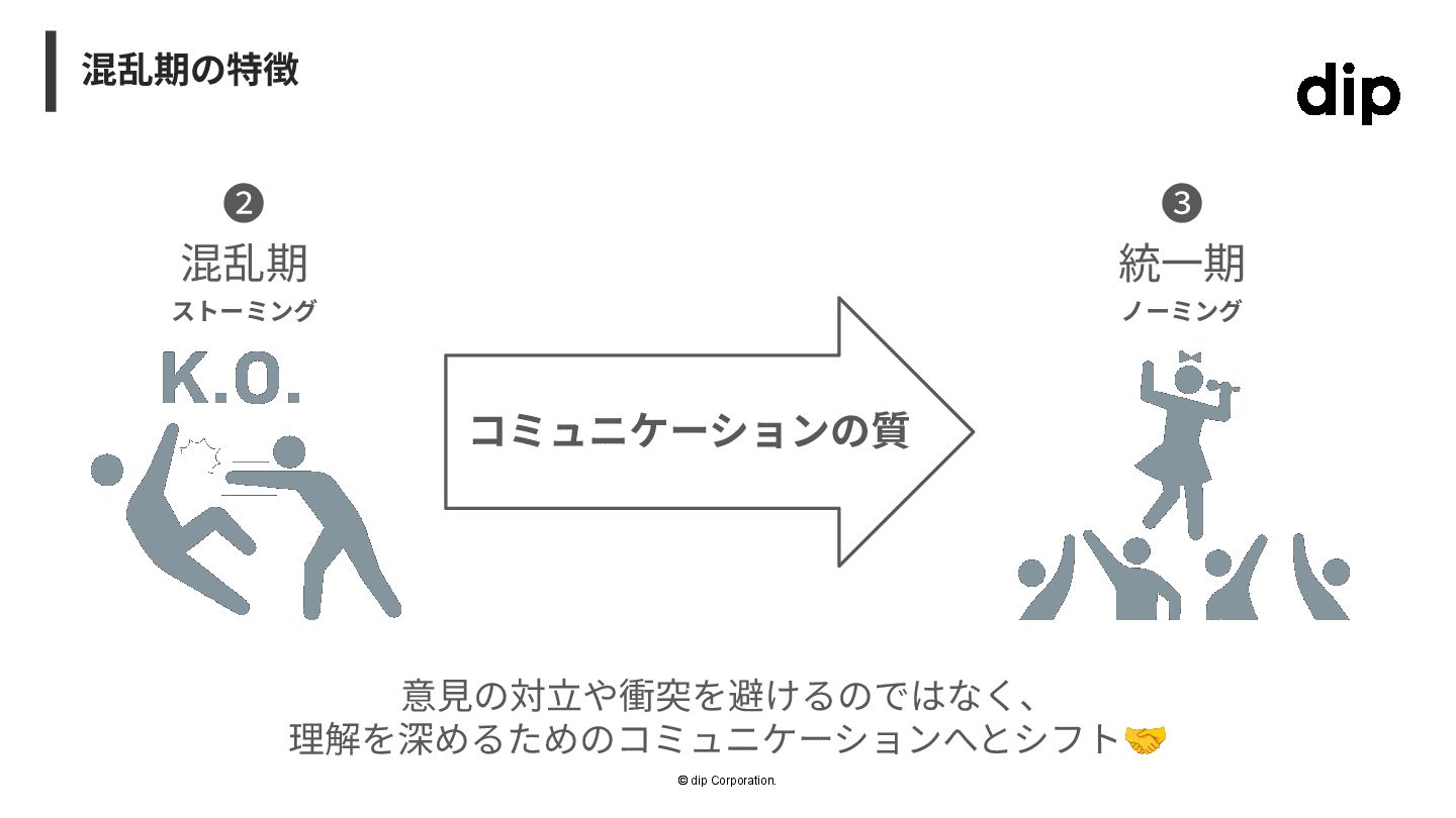 © dip Corporation. 混乱期の特徴 • 考えや意⾒の違いから衝突 • ⾃分ならこうするという意⾒がある • 影響⼒の⼤きい⼈が現れる