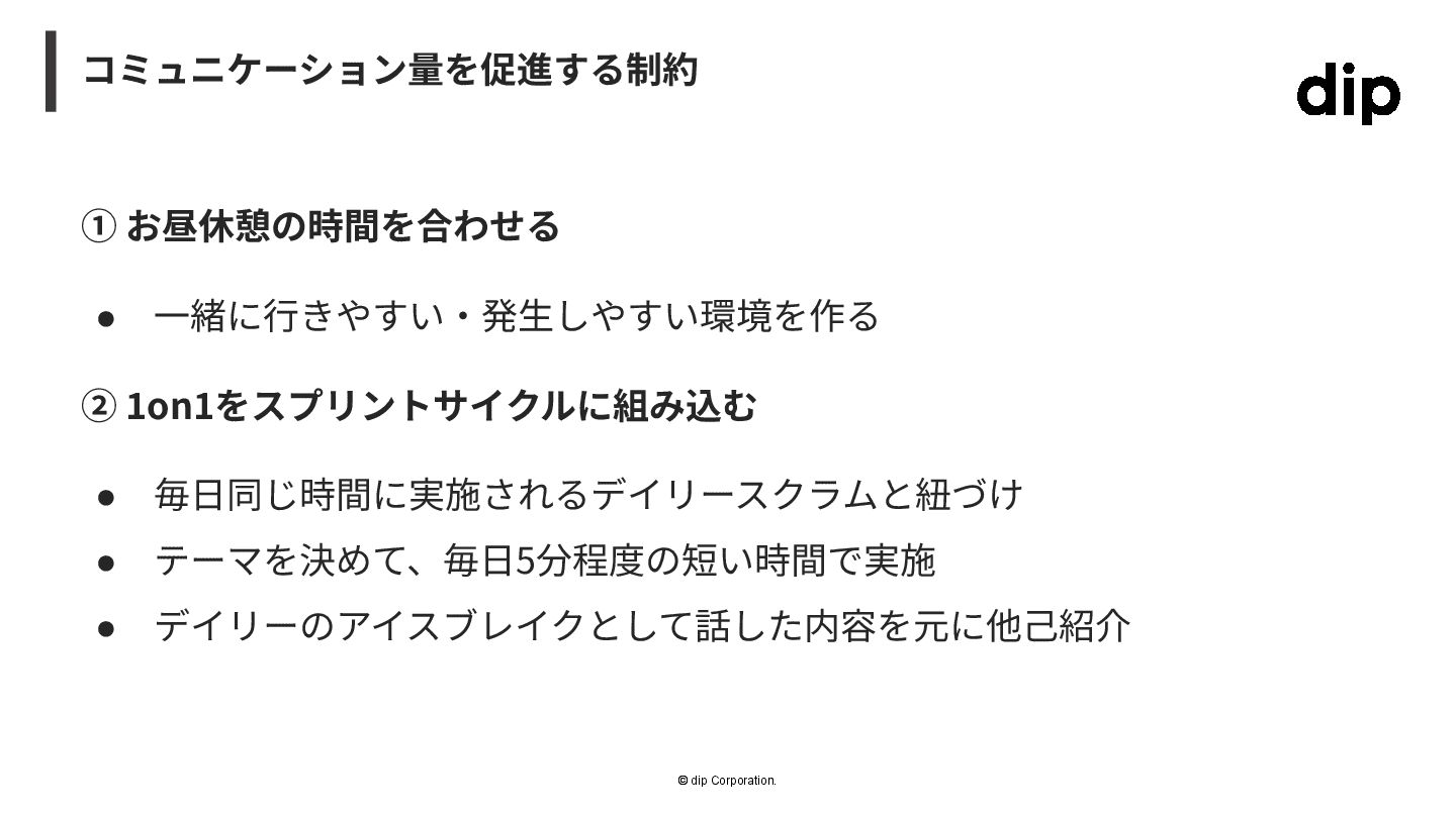 © dip Corporation. コミュニケーション量を促進する制約 ① お昼休憩の時間を合わせる • ⼀緒に⾏きやすい‧発⽣しやすい環境を作る ② 1on1をスプリントサイクルに組み込む