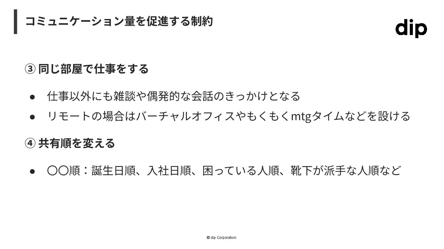 © dip Corporation. コミュニケーション量を促進する制約 ③ 同じ部屋で仕事をする • 仕事以外にも雑談や偶発的な会話のきっかけとなる • リモートの場合はバーチャルオフィスやもくもくmtgタイムなどを設ける