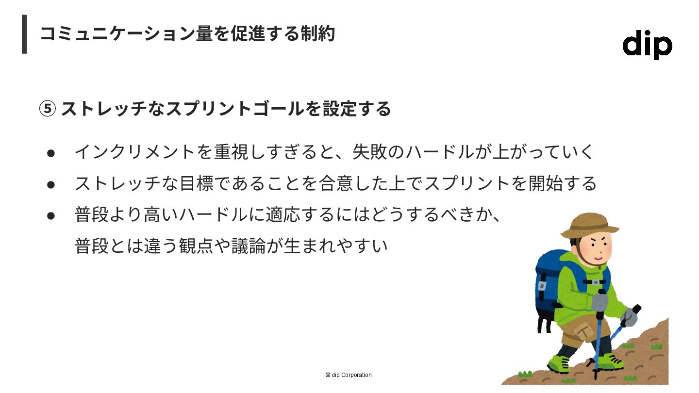 © dip Corporation. コミュニケーション量を促進する制約 ⑤ ストレッチなスプリントゴールを設定する • インクリメントを重視しすぎると、失敗のハードルが上がっていく • ストレッチな⽬標であることを合意した上でスプリントを開始する