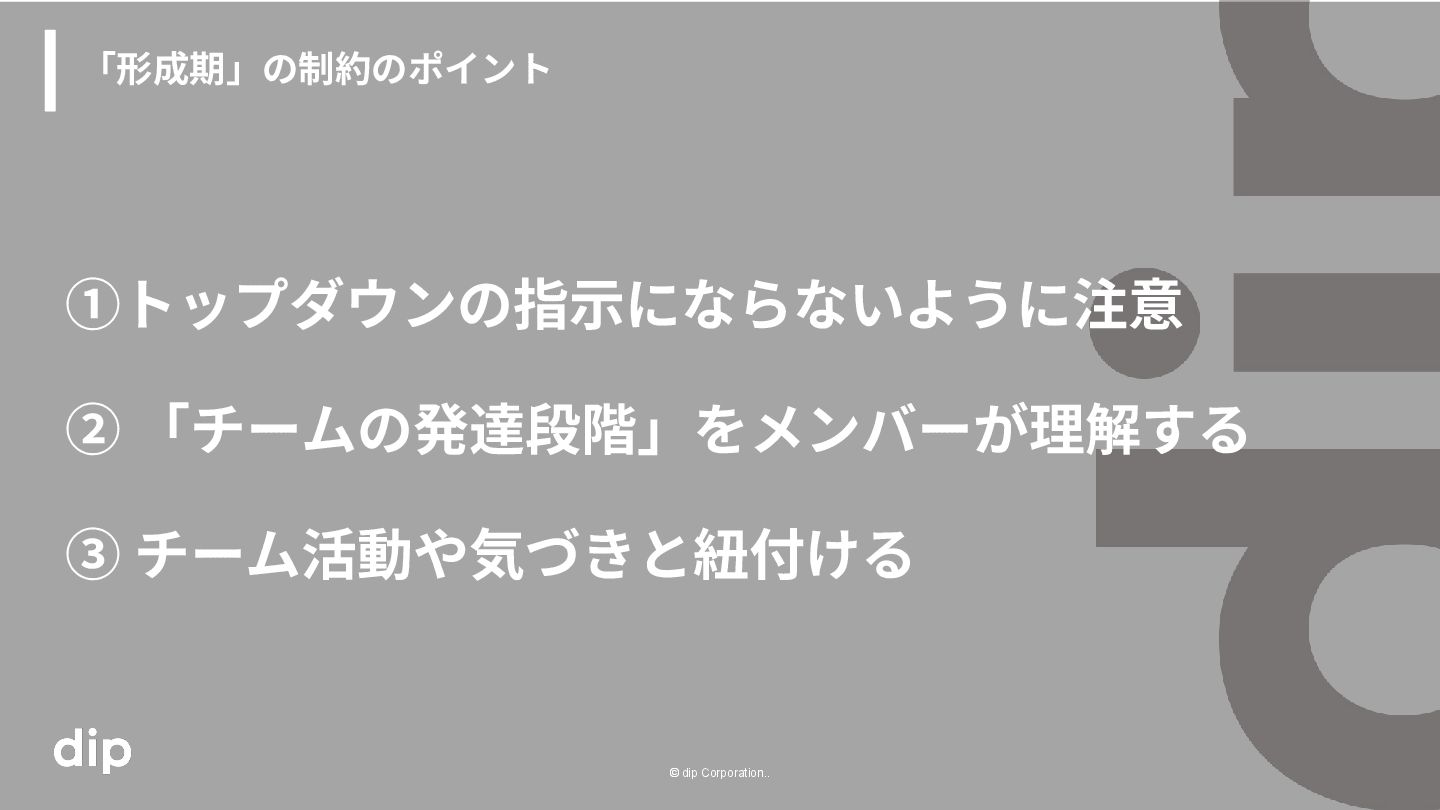 © dip Corporation.. ①トップダウンの指⽰にならないように注意 ② 「チームの発達段階」をメンバーが理解する ③ チーム活動や気づきと紐付ける 「形成期」の制約のポイント