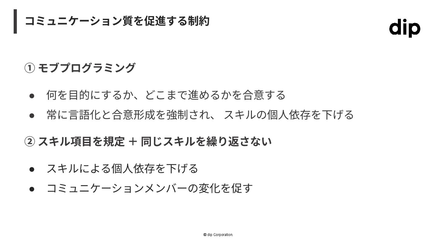 © dip Corporation. コミュニケーション質を促進する制約 ① モブプログラミング • 何を⽬的にするか、どこまで進めるかを合意する • 常に⾔語化と合意形成を強制され、
