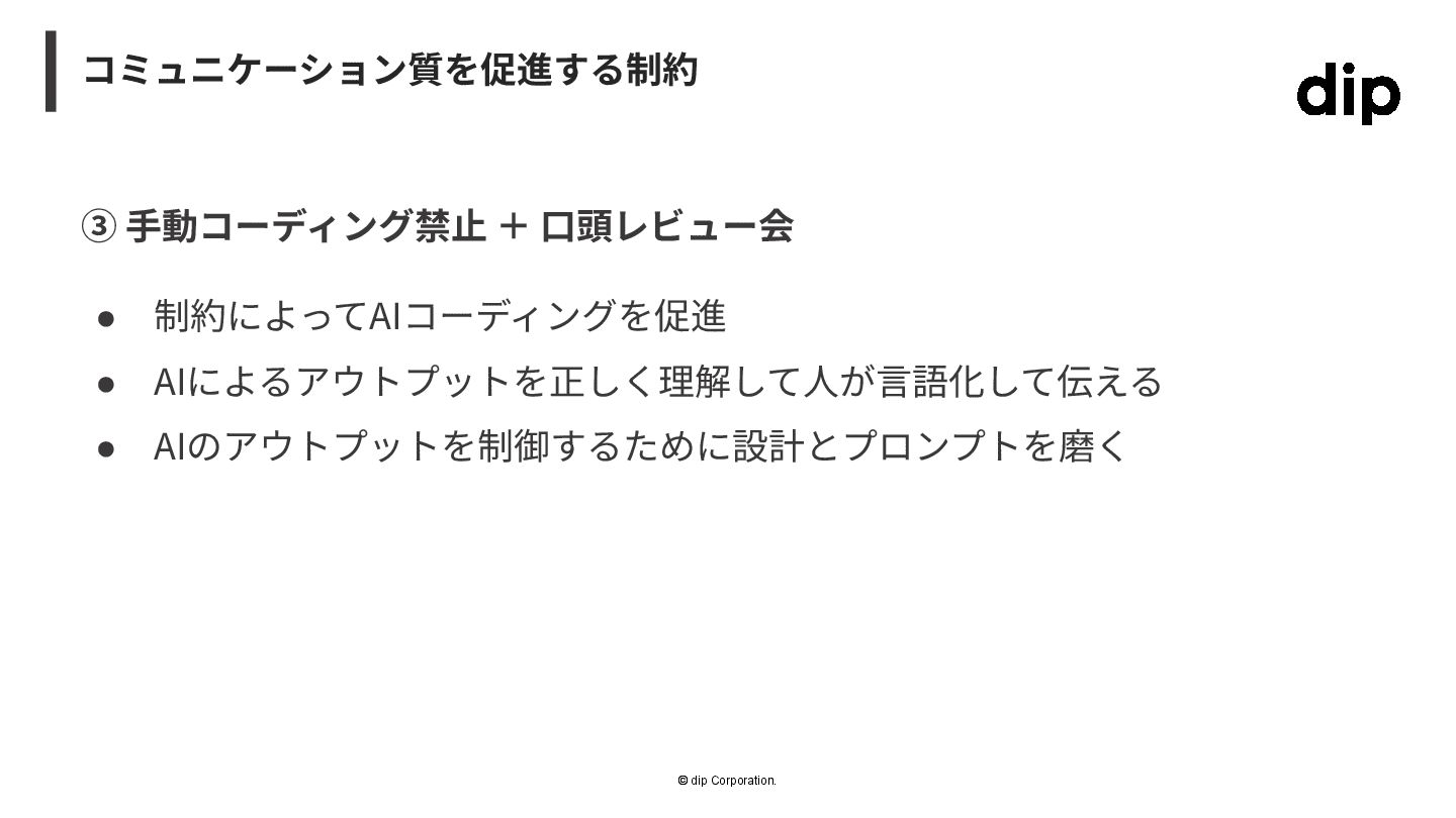 © dip Corporation. コミュニケーション質を促進する制約 ③ ⼿動コーディング禁⽌ + ⼝頭レビュー会 • 制約によってAIコーディングを促進