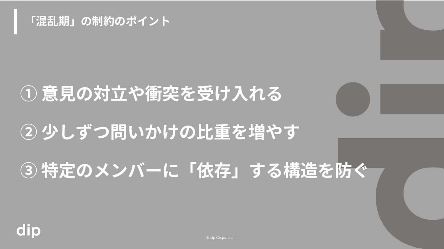 © dip Corporation.. ① 意⾒の対⽴や衝突を受け⼊れる ② 少しずつ問いかけの⽐重を増やす ③ 特定のメンバーに「依存」する構造を防ぐ 「混乱期」の制約のポイント
