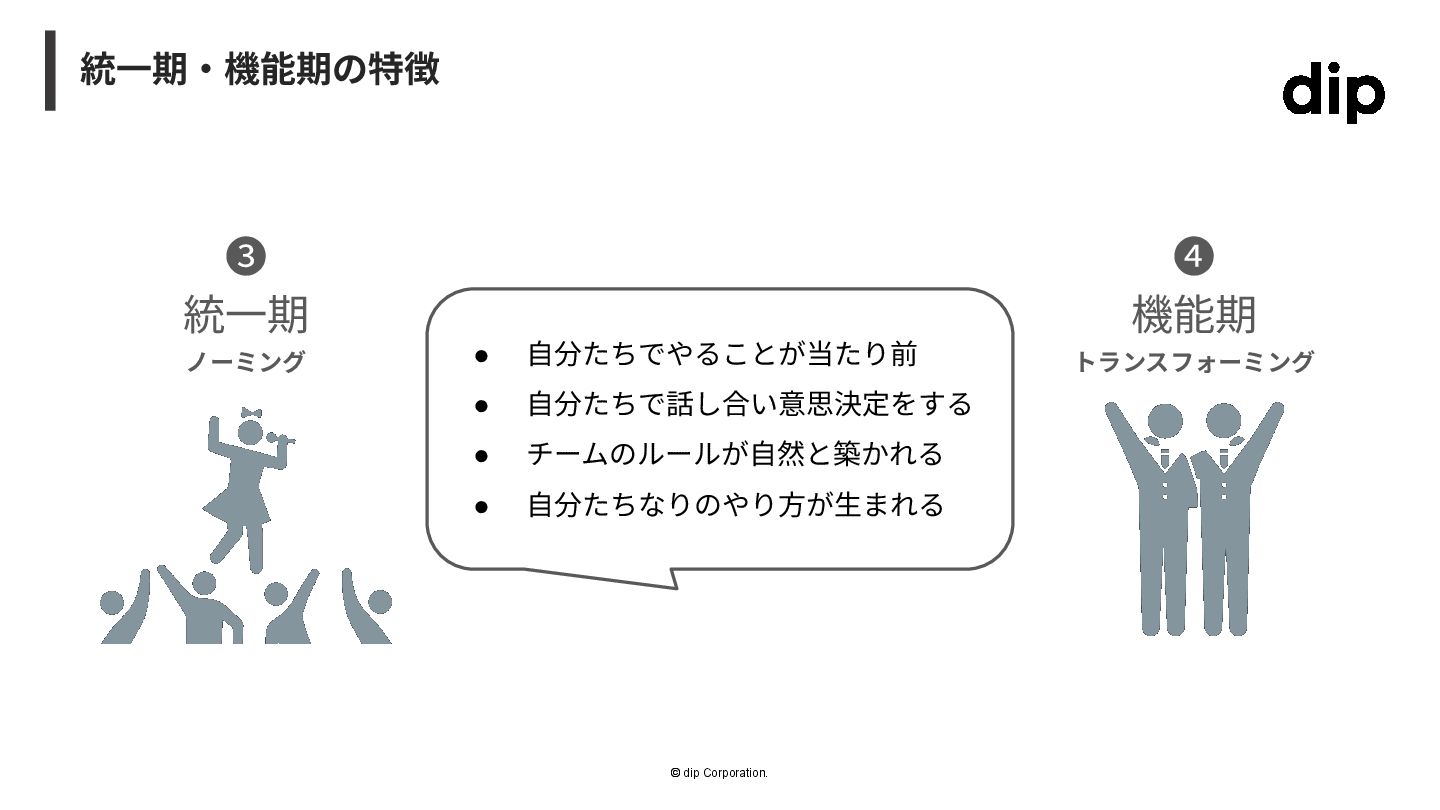 © dip Corporation. 統⼀期‧機能期の特徴 • ⾃分たちでやることが当たり前 • ⾃分たちで話し合い意思決定をする • チームのルールが⾃然と築かれる