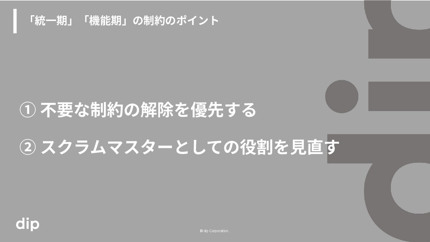 © dip Corporation.. ① 不要な制約の解除を優先する ② スクラムマスターとしての役割を⾒直す 「統⼀期」「機能期」の制約のポイント