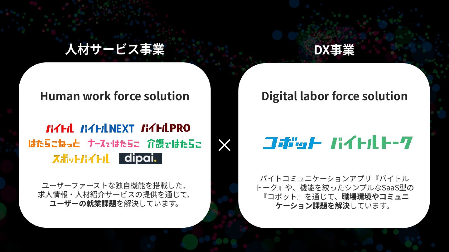 labor force solution バイトコミュニケーションアプリ『バイトル トーク』や、機能を絞ったシンプルなSaaS型の 『コボット』を通じて、職場環境やコミュニ ケーション課題を解決しています。 DX事業
