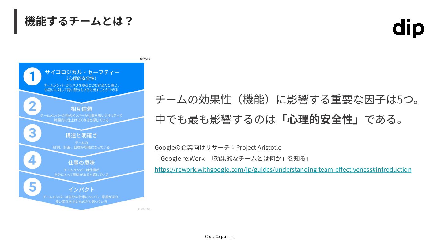 © dip Corporation. 機能するチームとは? チームの効果性(機能)に影響する重要な因⼦は5つ。 中でも最も影響するのは「⼼理的安全性」である。 Googleの企業向けリサーチ:Project Aristotle 「Google re:Work