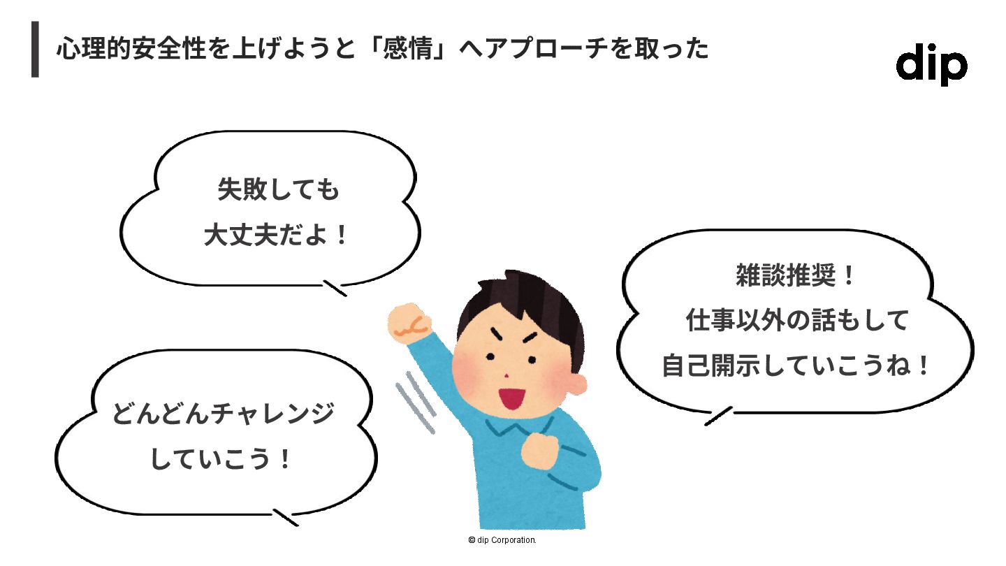 © dip Corporation. ⼼理的安全性を上げようと「感情」へアプローチを取った 失敗しても ⼤丈夫だよ! どんどんチャレンジ していこう! 雑談推奨! 仕事以外の話もして
